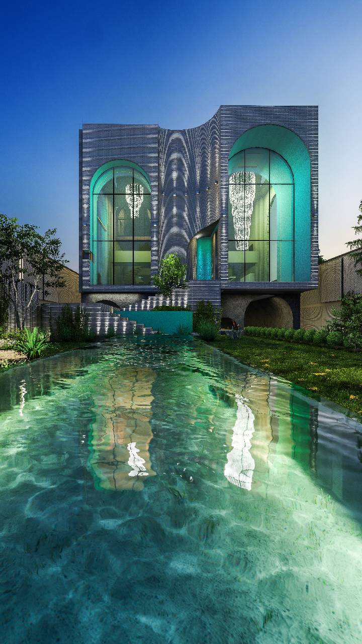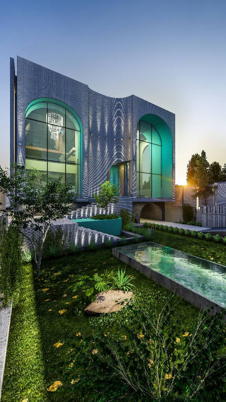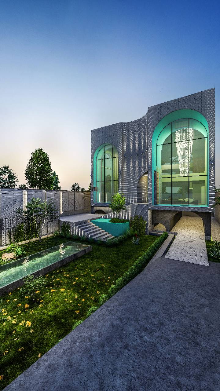 ایده اولیه شکل گیری پروژه، در جهت براوردن خواسته کارفرما یعنی ایده معماری سنتی طاق گونه ایرانی و سوق دادن آن به سمت معماری مینیمال بوده است. استفاده از منحنی در طراحی بنا و ارتفاع زیاد طبقه در بخش جلووی ساختمان و ایجاد نیم طبقه ها و در کنار ان استفاده از مصالح سنتی آجر با رنگ خنثی توسی، تا حد زیادی به مقصود اولیه پروژه نزدیک شدیم. استفاده از منحنی در طراحی جزییات مانند درب ورودی و فضای پارکینگ، حس یکدستی بیشتری به بنا داده و پله های محوطه با الهام از پله عمارت های قدیم، ولی با استفاده از فرم ساده و متریال هماهنگ با نما، علاوه بر عظمت بخشیدن به بنا، به مدرن بودن بنا نیز انجامید.